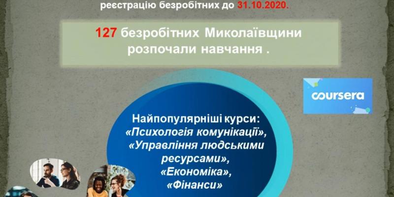 Завдяки міжнародній освітній платформі Coursera 127 безробітних Миколаївщини зареєструвались і розпочали проходження курсів «Психологія комунікації», «Управління людськими ресурсами», «Економіка», «Фінанси» тощо