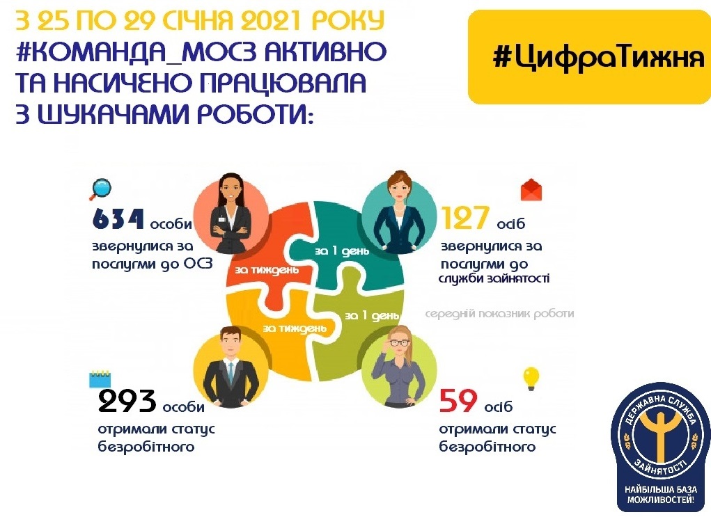 01.02.2021 | 16:25 Facebook Twitter Google+ Останній тиждень січня 2021 року характеризувався зниженням реєстрації громадян порівняно з попереднім тижнем. Так, в середньому за один робочий день за послугами зверталося 127 осіб.