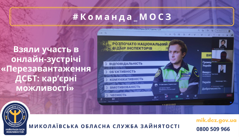 21 жовтня 2021 року фахівці Миколаївського обласного центру зайнятості взяли участь в онлайн-зустрічі «Перезавантаження ДСБТ: кар’єрні можливості» з нагоди відкриття набору на посади інспекторів до Державної служби України з безпеки на транспорті (ДСБТ). Захід був спрямований на популяризацію кар’єрних можливостей в сфері транспорту та інфраструктури. На зустрічі на питання відповідав Андрій Ткачов, директор департаменту контролю ДСБТ.