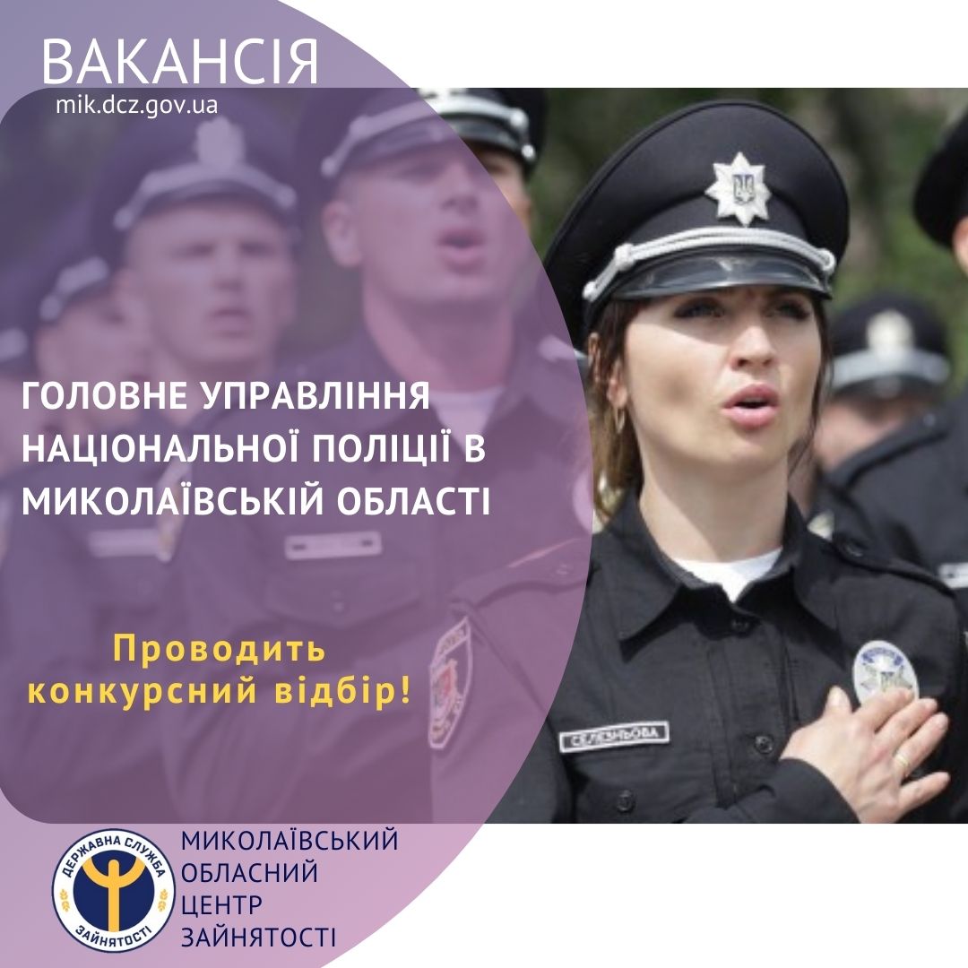 Головне управління Національної поліції в Миколаївській області пропонує пройти конкурсний відбір на вакантні посади: поліцейський сектору реагування патрульної поліції, поліцейський підрозділу поліції особливого призначення, помічник чергового, поліцейський ізолятору тимчасового тримання, поліцейський конвойної служби, поліцейський водій.